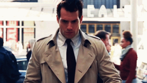 Clark Kent, dressed in a trench coat, dramatically reveals his Superman symbol in a bustling city street.