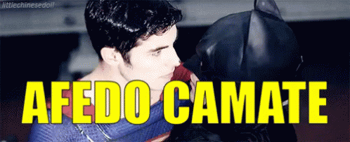 Superman and Batman in a tense moment, with the phrase 'Alfredo, calm down' overlaid. A classic superhero face-off.