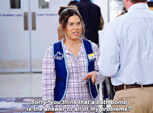 Amy Sosa from Superstore questions if a bath bomb is the answer to all her problems, wearing her Cloud 9 uniform.