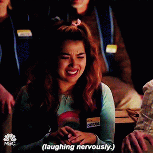 Cheyenne Thompson from Superstore laughing nervously and covering her face with her hands.