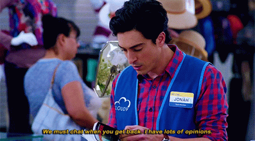 Jonah Simms from Superstore, wearing his Cloud 9 uniform, expresses his desire to chat and share opinions.