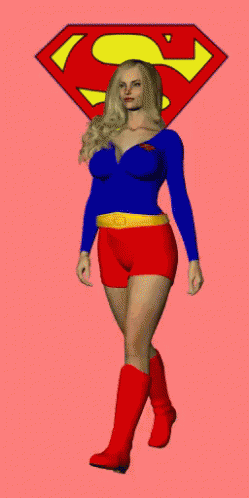 Woman in a Supergirl costume stands confidently before a Superman symbol.