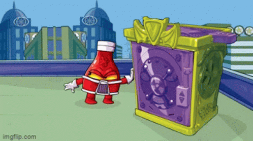 A Superzings Superthings ketchup bottle character stands next to a safe, then disappears as the safe glows.