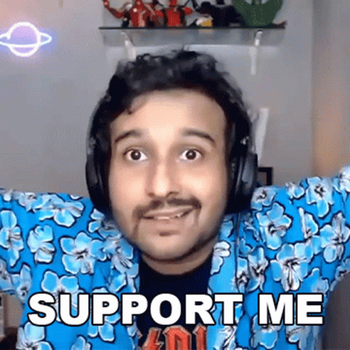 Comedian Sahil Shah with outstretched arms, smiling and asking for support, wearing a blue floral shirt.