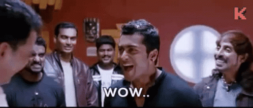 Suriya, the Tamil actor, reacts with an amazed 'Wow' while surrounded by friends.