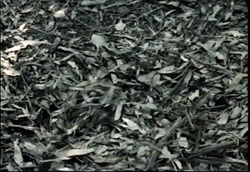 Mike Danton, buried in leaves, grimaces in a surprise attack from the film Deadly Prey.
