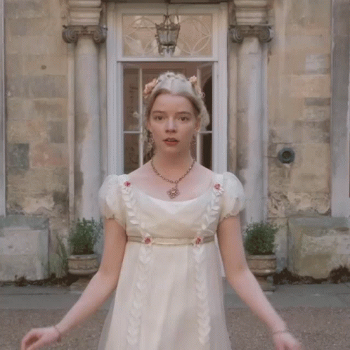 Anya Taylor-Joy as Emma Woodhouse looks surprised in a white Regency dress outside a grand building.