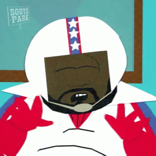 Jerome Chef Mcelroy from South Park looks surprised, wearing his superhero helmet and costume.