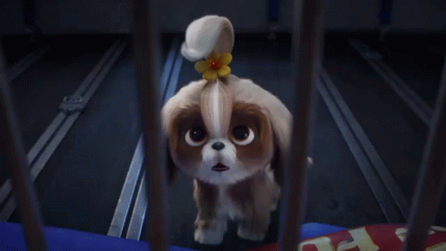 Daisy, the adorable dog from Secret Life of Pets, looks surprised and scared with a flower in her hair.