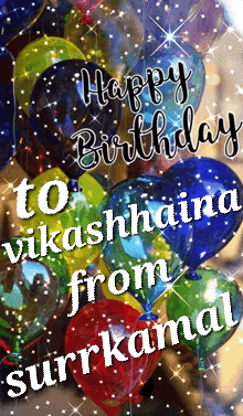 Happy Birthday message to Vikashhaina from Surr Kamal, featuring colorful balloons and sparkling glitter.