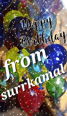 A festive birthday card featuring colorful, sparkling balloons and a special 'Happy Birthday from Surr Kamal' message.