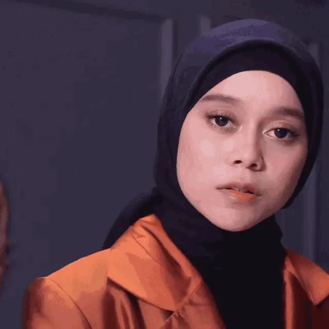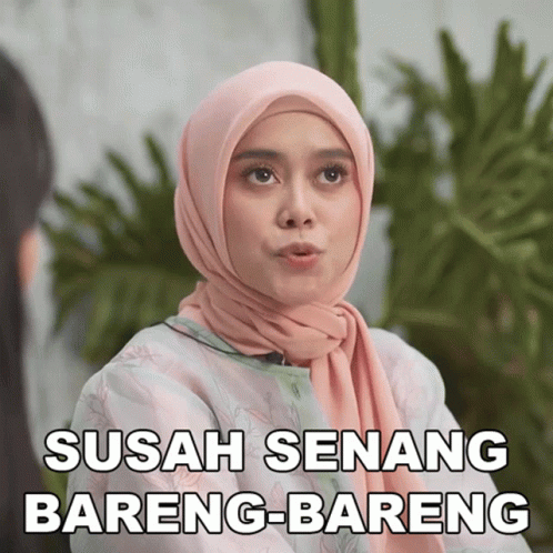 Lesti, wearing a pink hijab, speaks the phrase 'Susah Senang Bareng Bareng' (Difficult Happy Together).