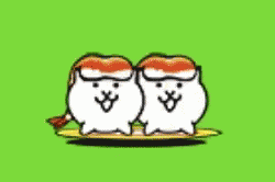 Two adorable cartoon Sushi Cats from The Battle Cats game wiggle on a yellow plate against a vibrant green background.