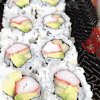 Close-up of a delicious sushi platter featuring avocado, crab, and shrimp rolls, showcasing vibrant colors.