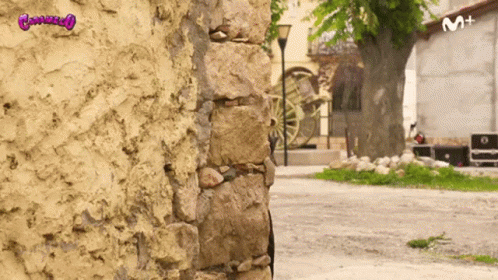 Susi Caramelo peeks playfully from behind a rustic stone wall, engaging in a game of hide-and-seek.