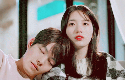 Bae Suzy and Kim Woo Bin share a tender moment, with Kim Woo Bin resting on Bae Suzy's shoulder.