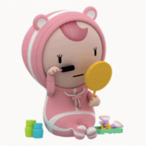Sva Goblue, a cute cartoon character, applies makeup while looking in a mirror.