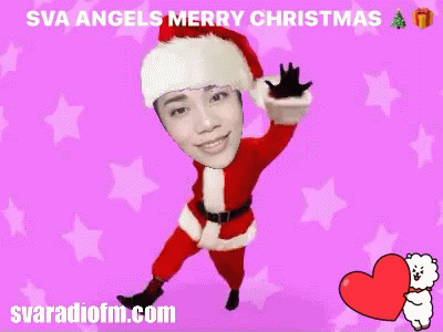 SVA Angels Christmas greeting featuring a person in a Santa costume with a smiling face, dancing on a pink background.
