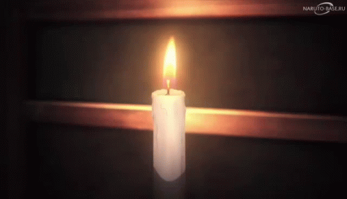 A single white candle burns brightly, its flame flickering gently in a dark room, casting a warm glow.
