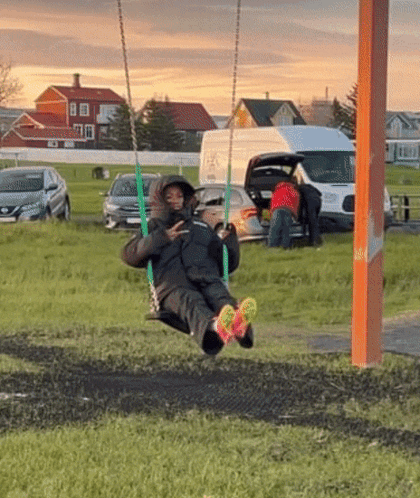 Sveindis Jonsdottir enjoys a playful swing ride in a scenic Icelandic setting.