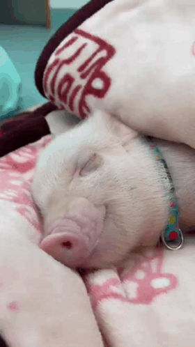 A cute piglet sleeping soundly on a soft pink blanket, briefly yawning before returning to slumber.
