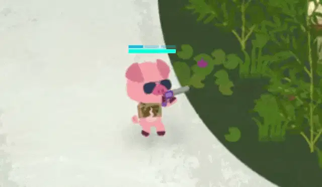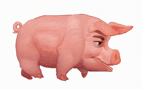 A cheerful cartoon pig walks across a white background, looking towards the viewer with a slight smile.