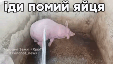 A pig is being washed with water, humorously told to "go wash your balls" by the Ukrainian caption.