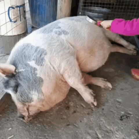A large, relaxed pig enjoys a gentle brushing from a person, lying comfortably on its side.