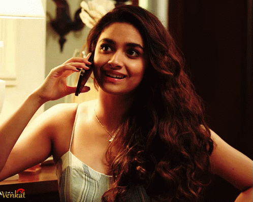 Keerthy Suresh from Sarkaru Vaari Paata looks shocked while talking on a cell phone.