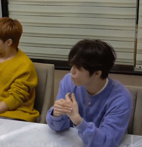 Seventeen's Lee Chan (Dino) dabs enthusiastically while sitting at a table, bringing joy to those around him.