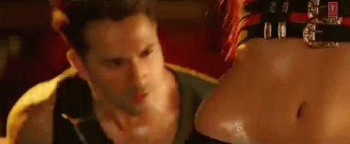 Varun Dhawan intently flicks sweat from a woman's glistening midriff during a dance sequence.