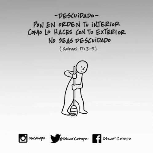 A stick figure drawing by oscampo of a person sweeping, with a Spanish quote about putting your interior in order.