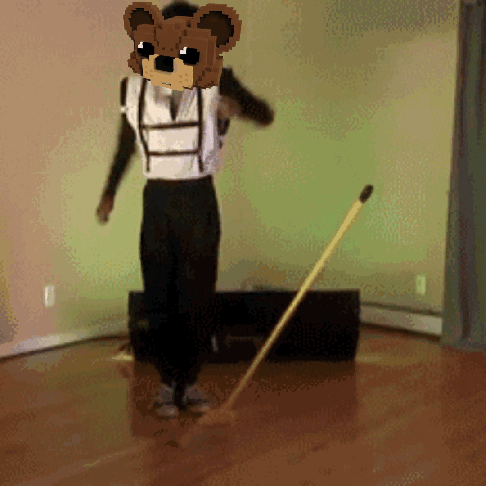 A person wearing a pixelated bear mask performs a dance while holding a broom, incorporating sweeping motions.