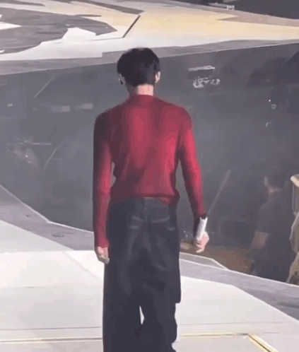 Yeonjun from TXT on stage in a red sweater and black pants, holding a microphone, appearing upset.
