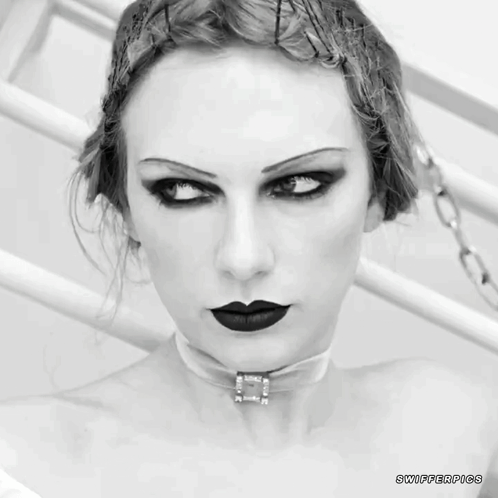 Taylor Swift in a striking black and white portrait from Swifferpics, featuring dramatic makeup and a choker.