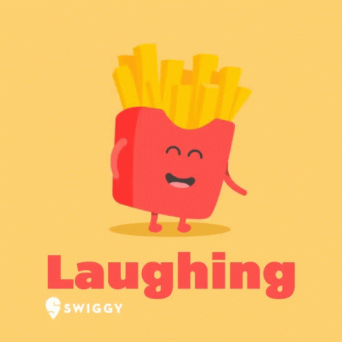 An adorable animated Swiggy French Fries character giggles happily, promoting the food delivery service.