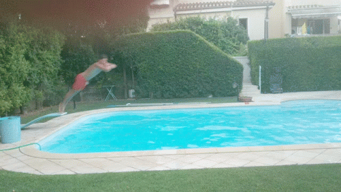 A person performs a graceful dive into a bright blue swimming pool from the edge.