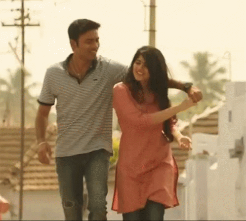 Dhanush and Megha from "Enai Noki Paayum Thota" happily walk hand-in-hand, swinging their arms.