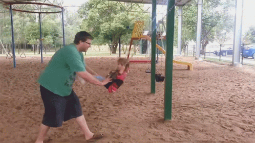 A man in a green shirt pushes a child on a swing at a playground, smiling and waving at the camera.