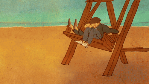 Puuung and partner share a romantic moment on a wooden swing at the beach, enjoying the serene atmosphere.