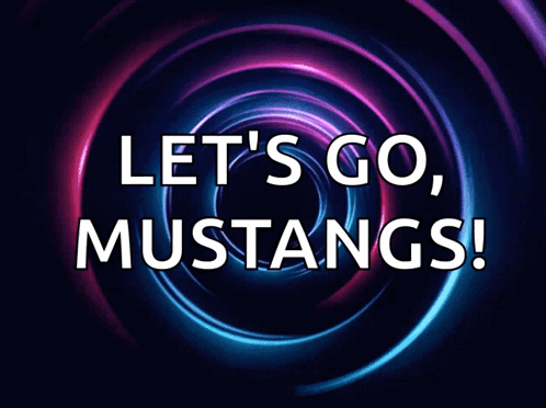 Vibrant purple and blue swirling circles with the motivational text 'LET'S GO, MUSTANGS!' appearing in the center.