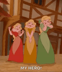 Three animated princesses from Beauty and the Beast swoon dreamily, exclaiming 'MY HERO!' in front of a wooden building.