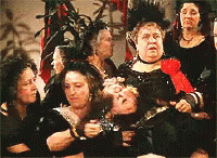 A group of women in black dresses and hats support one woman who appears to be swooning or fainting.