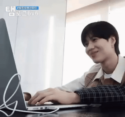 Taemin from Swtsoob smiling while typing on a laptop keyboard.