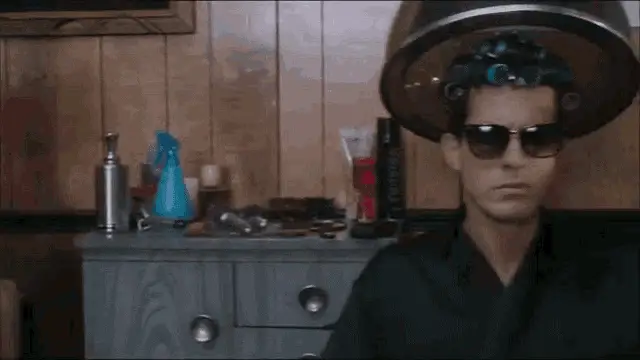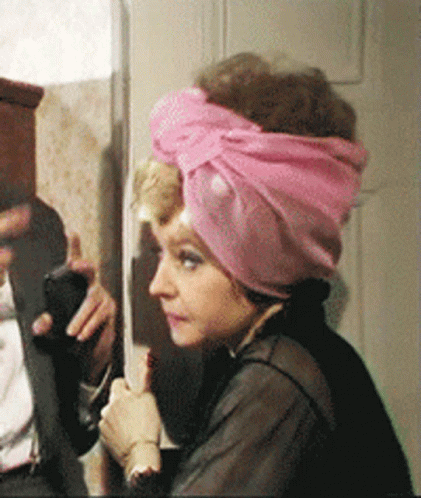 Sybil Fawlty, with curlers and a pink headscarf, shows a surprised or questioning reaction.