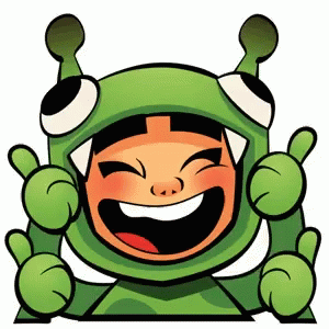 Yutani from Subway Surfers, a cheerful character in a green monster costume, gives a double thumbs up.