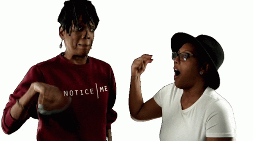 Sylkiesly and Bdh Collective members interact, one in a red "NOTICE ME" sweater, the other in a white shirt, snapping fingers.