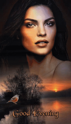 A beautiful digital painting featuring a woman, a bird, and a sunset landscape, with 'Good Evening' text.