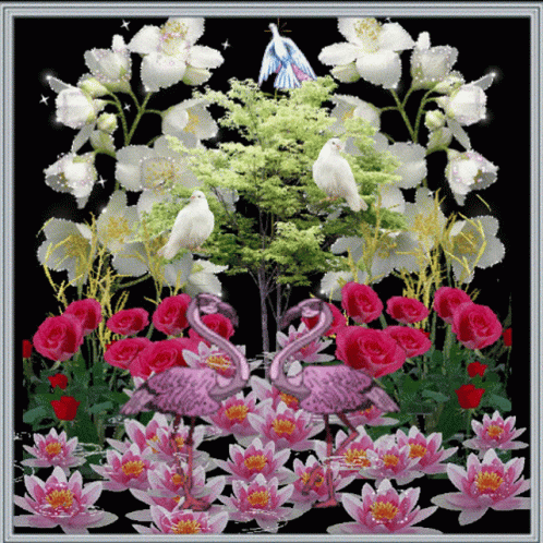 Animated scene with white doves, pink flamingos, and a vibrant array of white, red, and pink flowers.