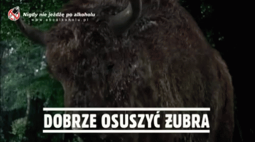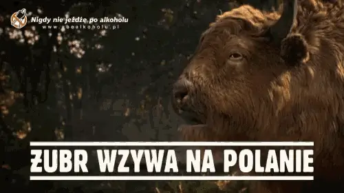 A majestic bison shakes off water in a forest, accompanied by a Polish anti-drinking and driving message.